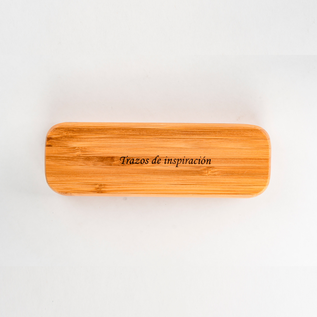 Lapicero y estuche de madera natural con grabación personalizada a láser.
